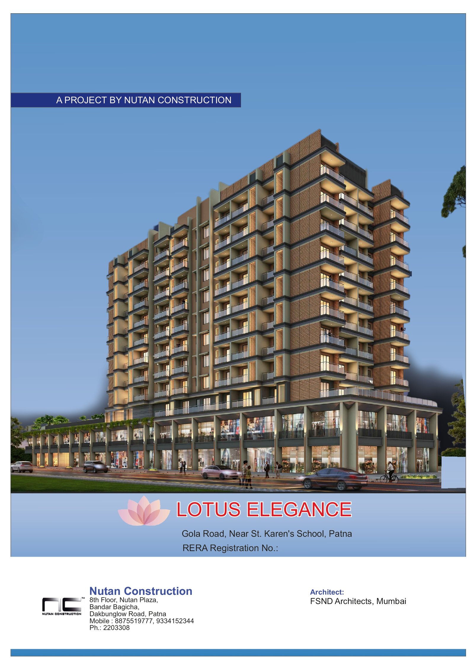 Lotus Elegance, located on Gola Road near St. Karen’s School, Patna, offers premium homes built with earthquake-resistant RCC structure and top-grade materials from brands like TATA Steel, Ultratech, and Kajaria. Each flat features vitrified tile flooring, modular kitchen with granite countertop, UPVC windows, and branded sanitary fittings. With 24-hour water supply, power backup, basement parking, high-speed lifts, and advanced security with CCTV and fire systems, Lotus Elegance ensures comfort, safety, and modern living in a prime Patna location.